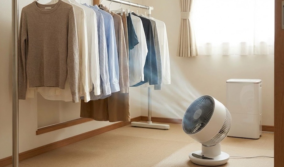 部屋干しを効率よく乾かすための最大のポイントは、「空気の流れ」を作ることです。ただ干すだけでは、湿った空気が洗濯物の周りに滞留してしまい、乾きが遅くなります。そこで活躍するのが、サーキュレーターや扇風機です。